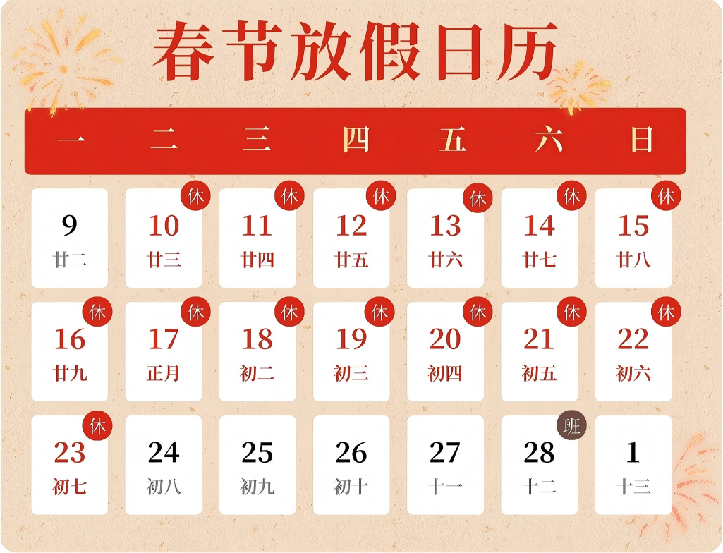 根據國家節假日安排及我司實際情況,2026年春節假期安排如下: